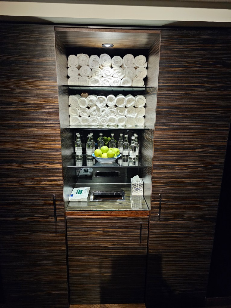 Towel and bottled water are available (which I use it as my water top up point).