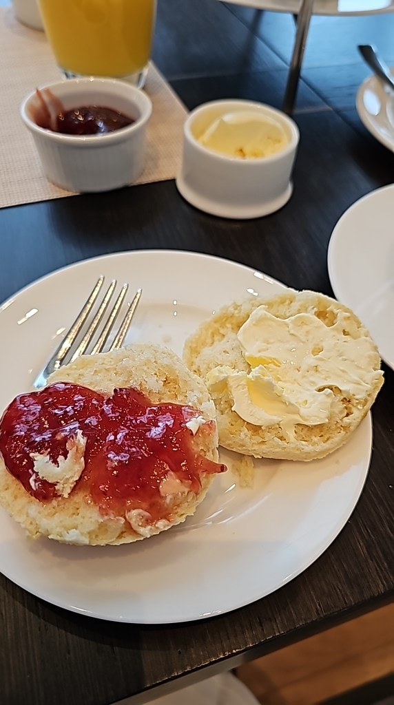 The afternoon tea comes as a set which include English scones with jam and clotted cream, and a mixture of sweet and savory items.