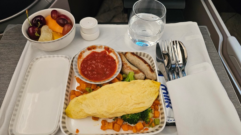 The food was a single tray service with a smaller bakery selection. Being breakfast service, the BTC options were limited. I prebooked the omelet with veal sausage. The omelet was not salty while the sausage was sadly ignored.